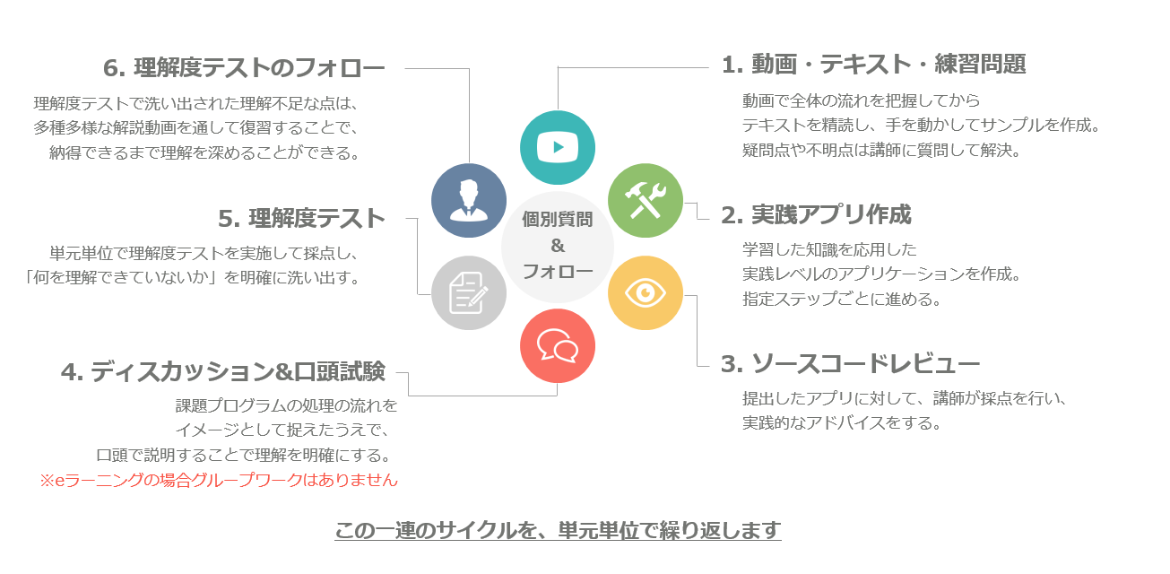 下の図は、eラーニングの進め方の概要を表しています。この一連のサイクルを、単元単位で繰り返します。