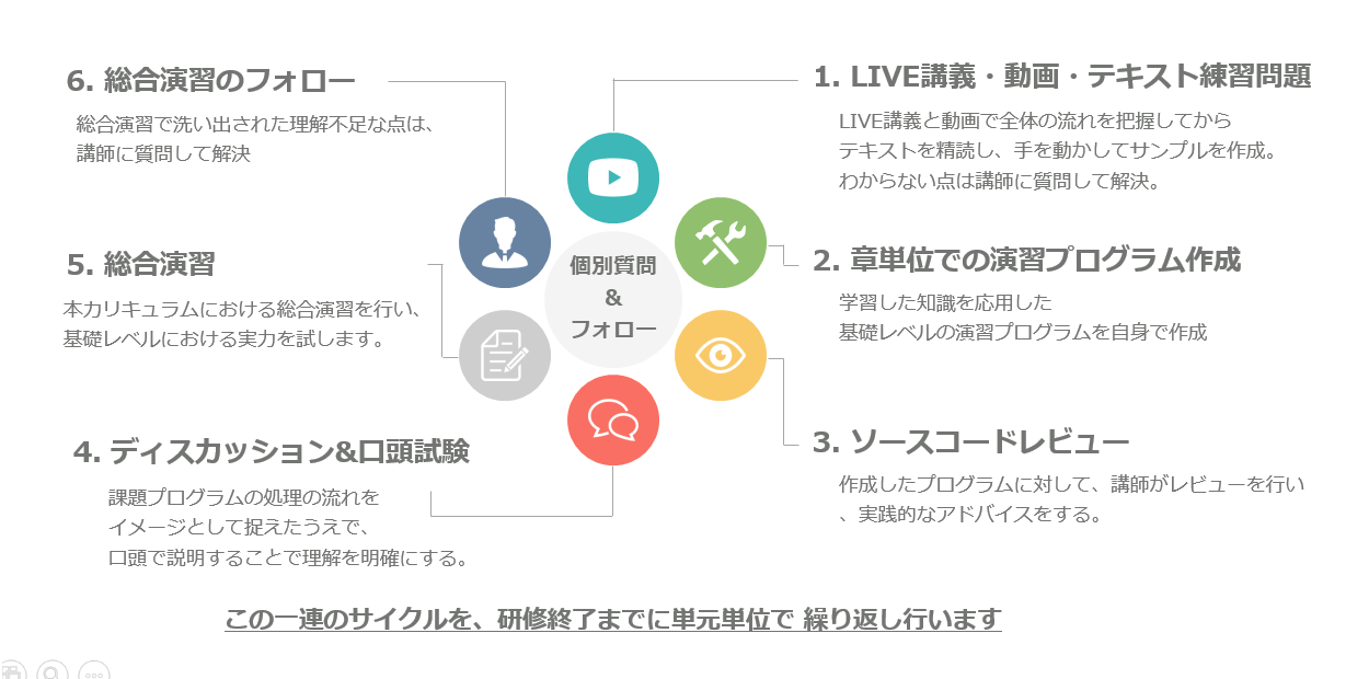 初心者が躓きやすい内容に対し、サンプルコードを題材に処理の流れを整理し、受講者同士で議論を交わしながら理解を高めていく独特なアプローチによる効果的な学習手法を取り入れています。