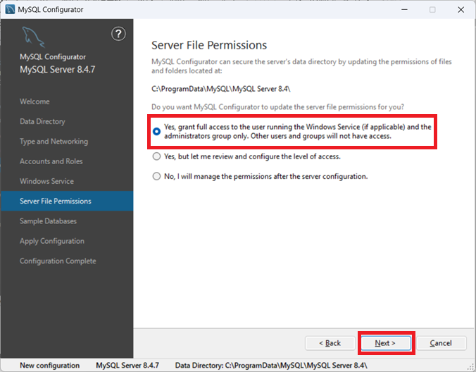 ここではMySQLサーバーが利用するファイルシステム上のディレクトリやファイルへのアクセス権限を設定します。