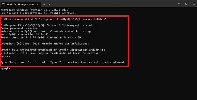 MySQLが正常に動作しているか、コマンドプロンプトからMySQLクライアントを起動し確認します。