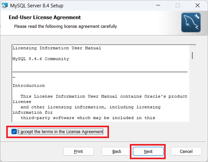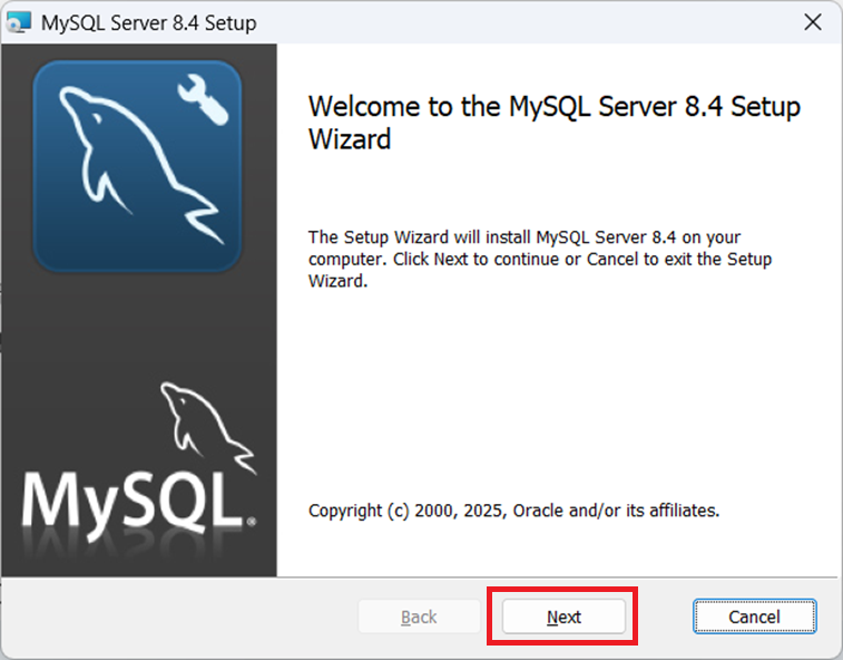 ①ダウンロードした「mysql-8.4.x-winx64.msi」をダブルクリックすると、セットアップ画面が表示されるので「Next」をクリックします。