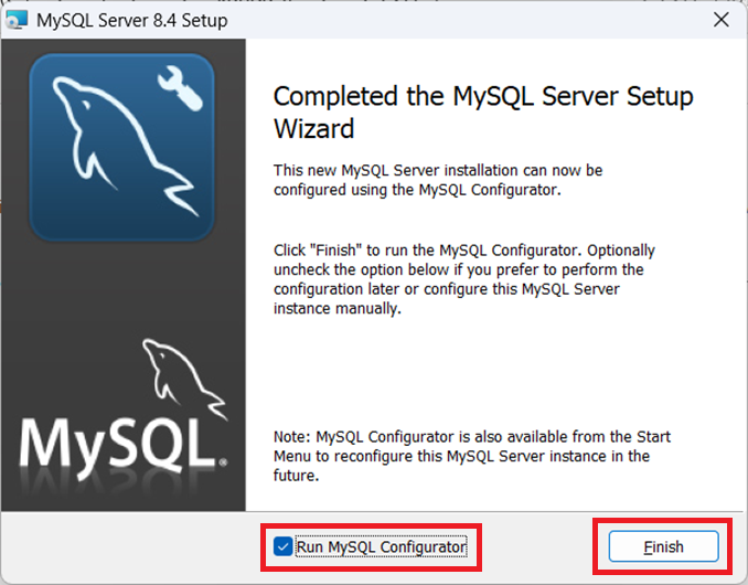⑤「Run MySQL Configurator」にチェックがついている事を確認し、「Finish」をクリックします。