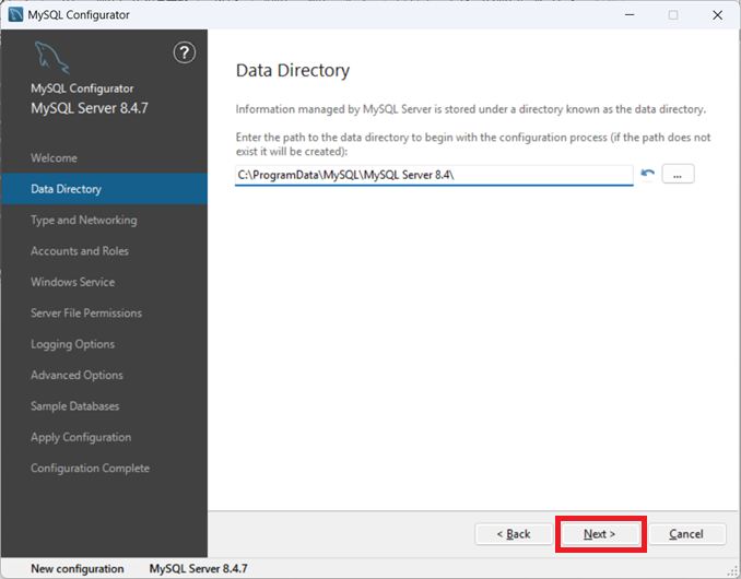 ②そのまま「Next」をクリックし、MySQLのデータベースの保存先を決定します。