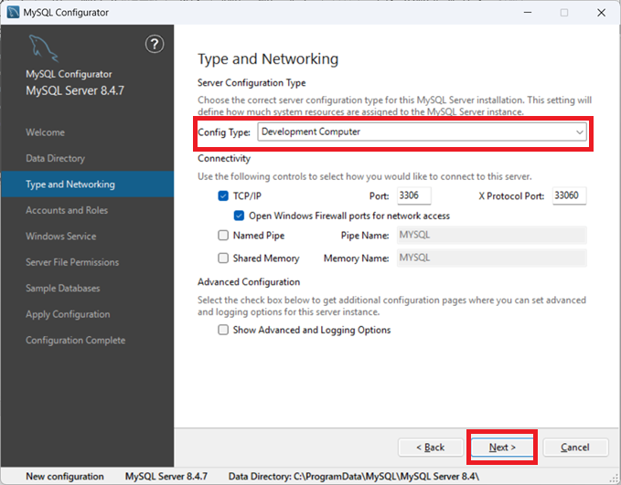 ③この画面では、MySQLサーバーのタイプとネットワーク関連の設定を行います。 ここで指定する内容によって、MySQLサーバーの用途・接続方法が決まります。 今回は個人開発で使用するため「Development Computer」を選択して「Next」をクリック。