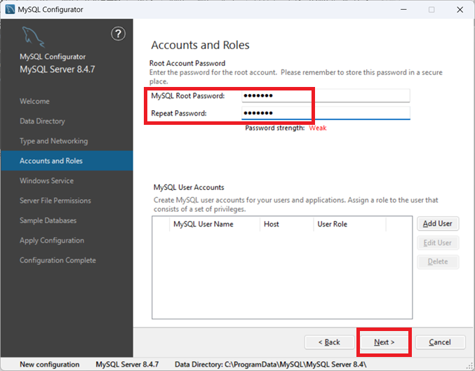 ④rootパスワードを決める画面となります。MySQL Root PasswordとRepeat Passwordに「root123」と入力し、「Next」をクリックします。