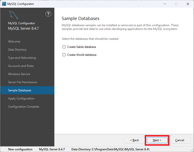⑦サンプルデータベースの作成確認画面となるので、何もチェックを付けずそのまま「Next」をクリックします。