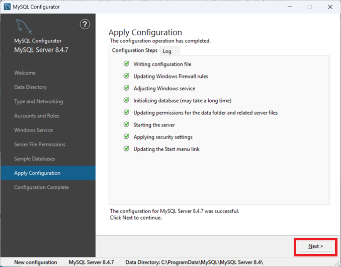 ①MySQL Configurator画面が表示されたら「Next」をクリックします。