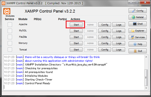 XAMPPコントロールパネルが起動したら、Apacheの横にある「Start」ボタンをクリックしApacheを開始します。