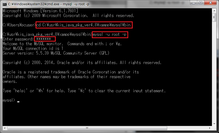 MySQL(MariaDB)が正常に動作しているか、コマンドプロンプトからMySQL(MariaDB)クライアントを起動し確認します。