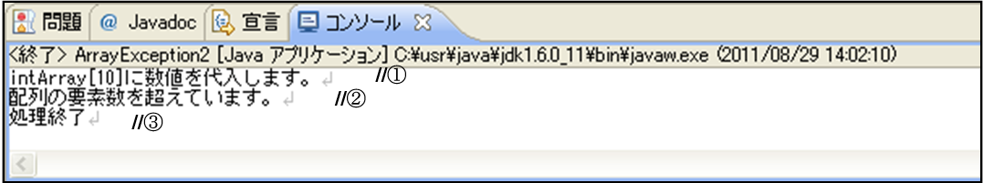 System.out.println("intArray[10]に数値を代入します。"); //①