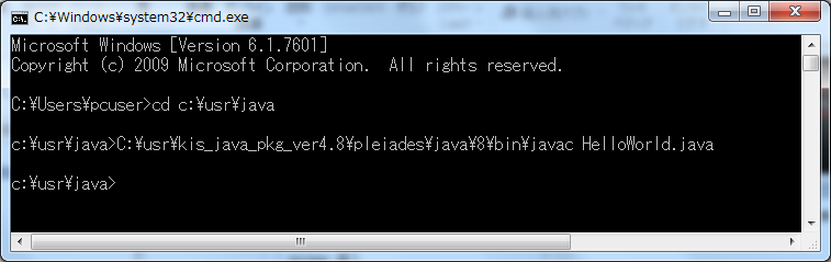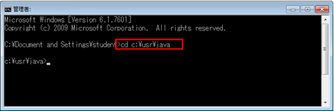 カレントディレクトリを、前項で作成されたクラスファイルが格納されている場所(c:\usr\java)に移動するために、下記コマンドをコマンドプロンプトへ入力し、Enterキーを押下します。
