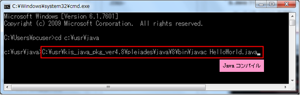 図 2.2.6 : コンパイラ(javac)を使用し、コンパイルを行うコマンド