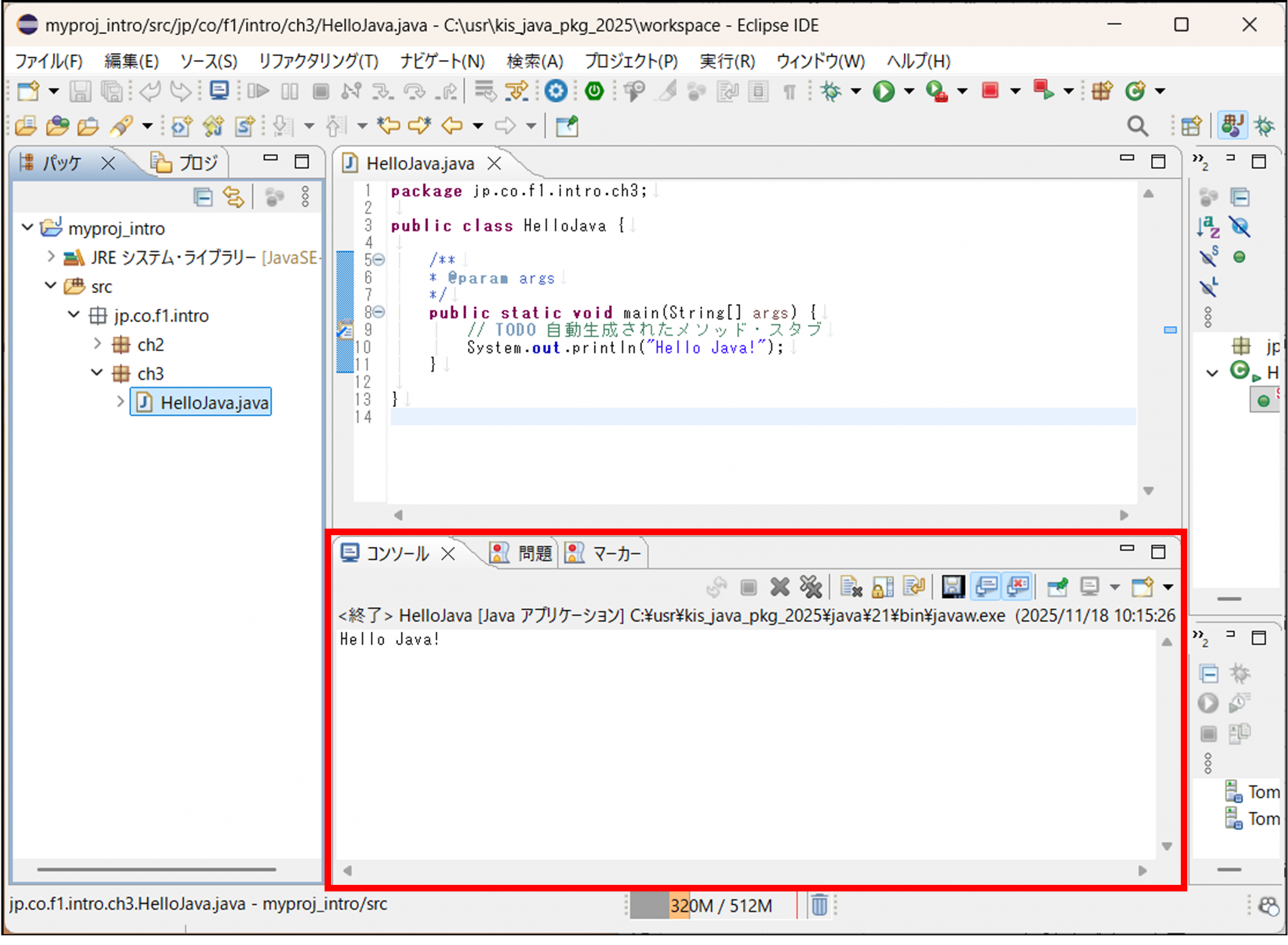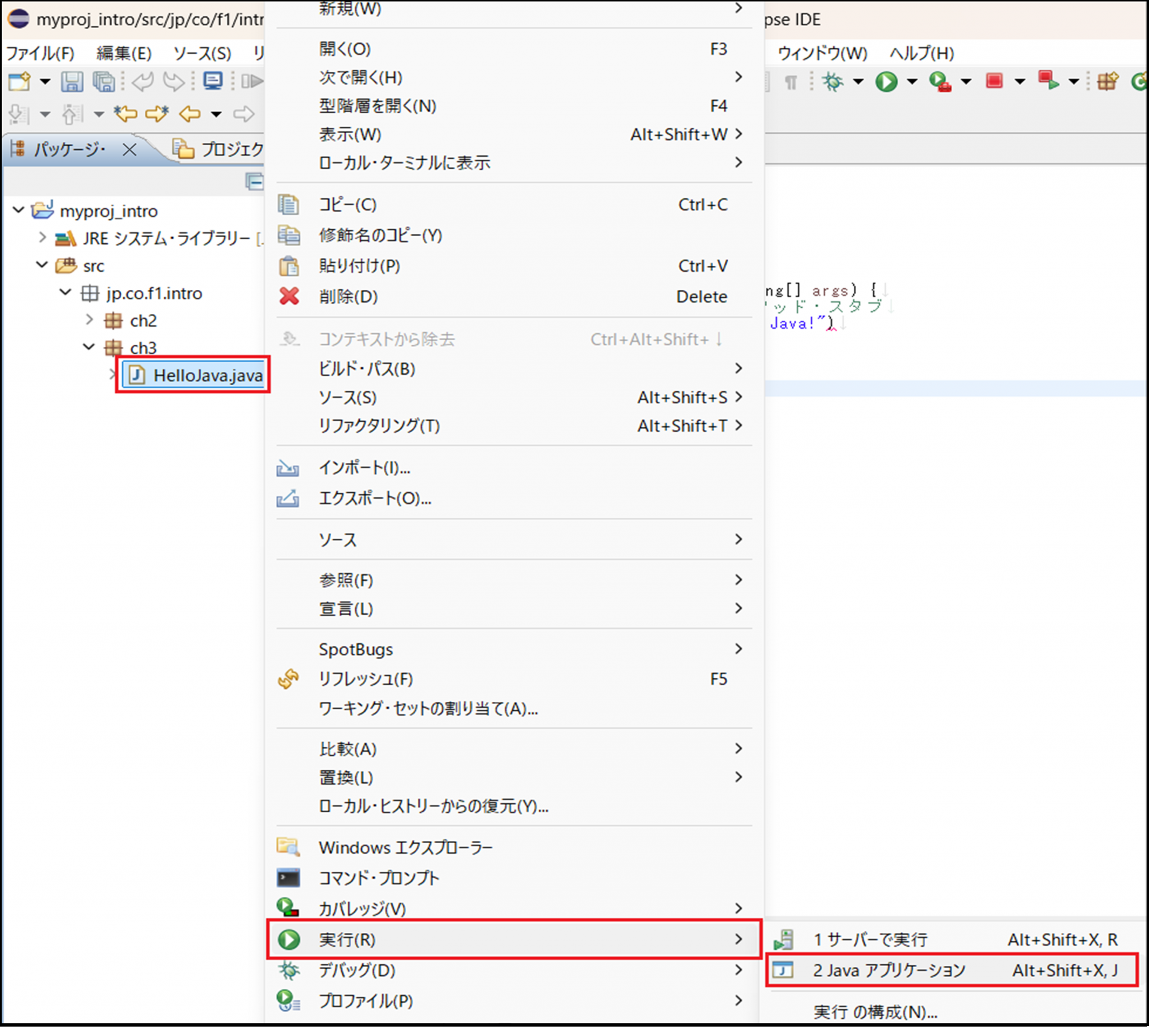 HelloJava.javaを右クリック > 実行 > Javaアプリケーション