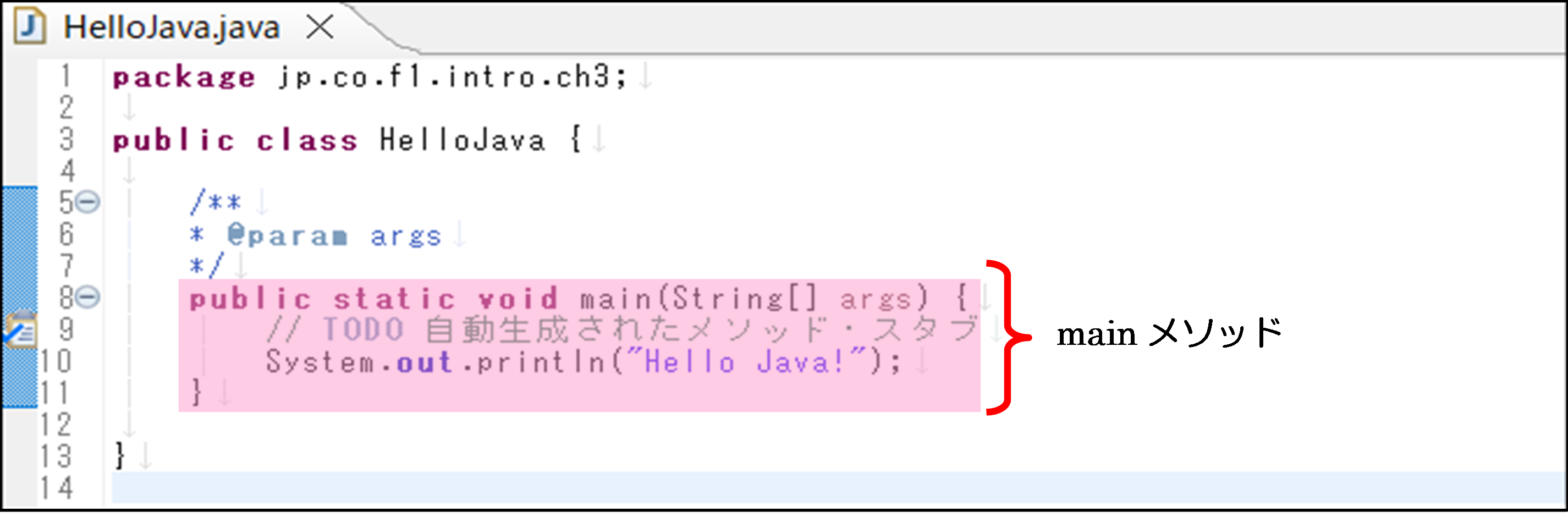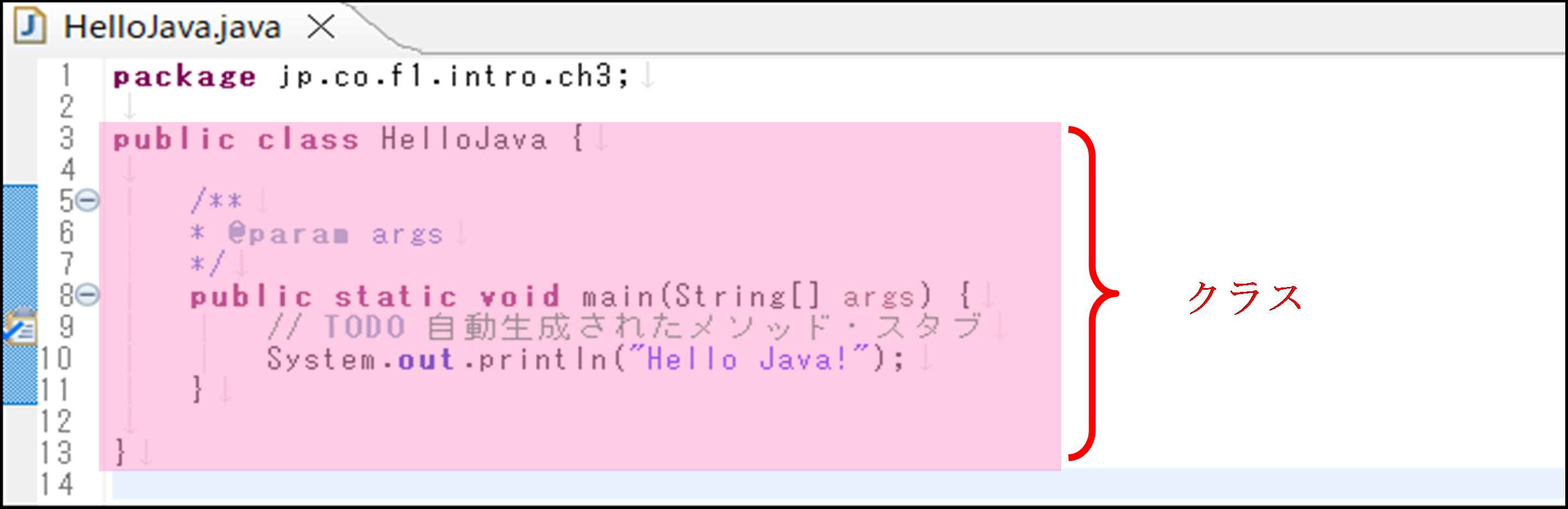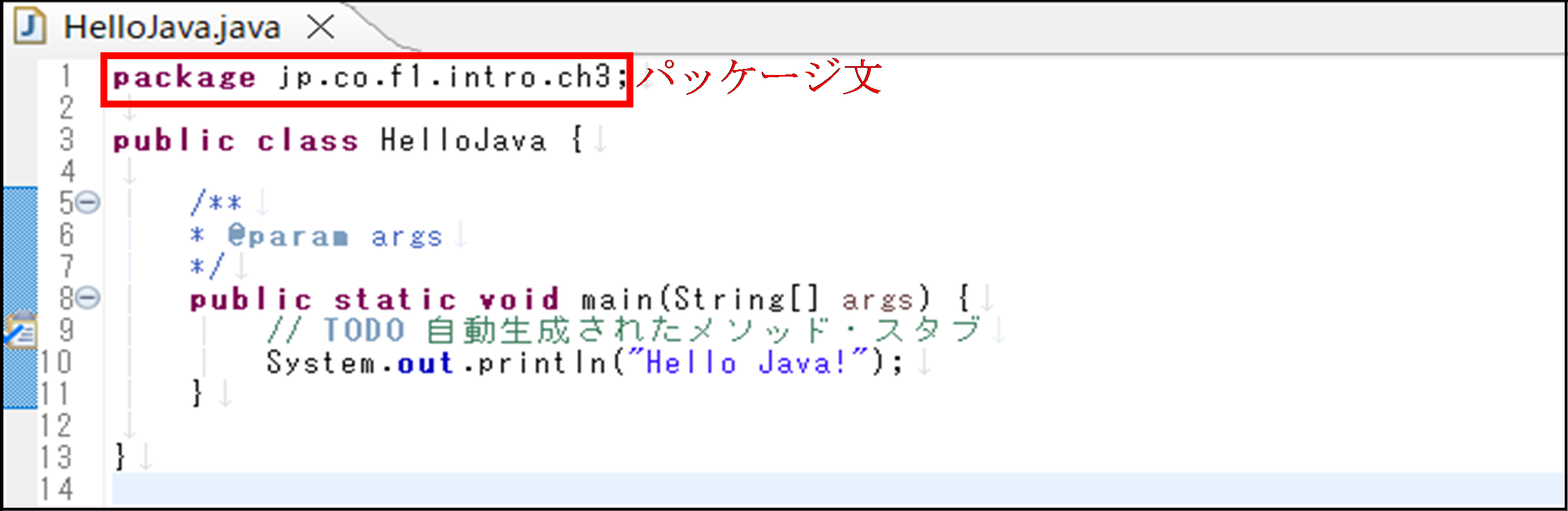 それでは、このHelloJavaプログラムの記述を詳しく解説していきます。