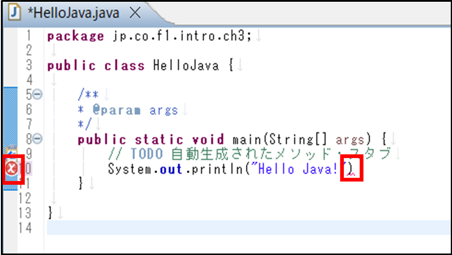 コンパイルエラーの発生下図では、10行目に赤い波線と×印が表示されています。