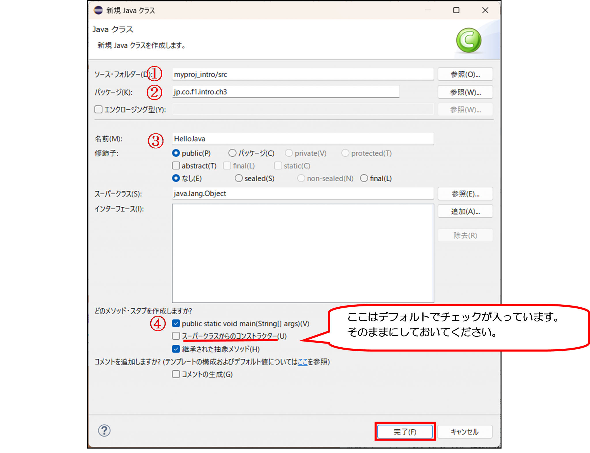 新規Javaクラスウィンドウが表示されますので、次の項目を記入し、「完了」をクリックします。