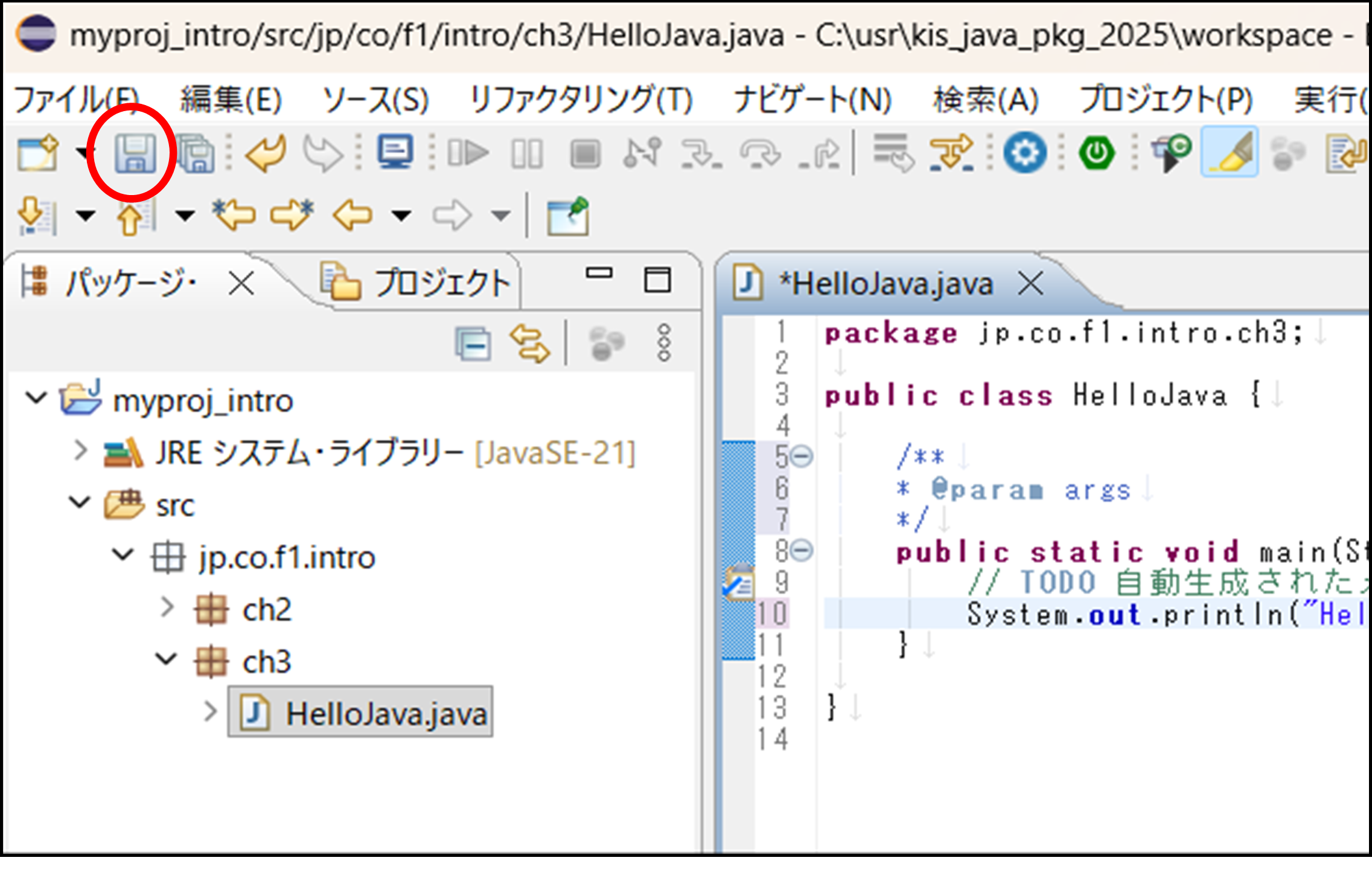 サンプルコードと同じ記述にできたら、Eclipse画面の左上のフロッピーアイコンをクリックし、保存します。