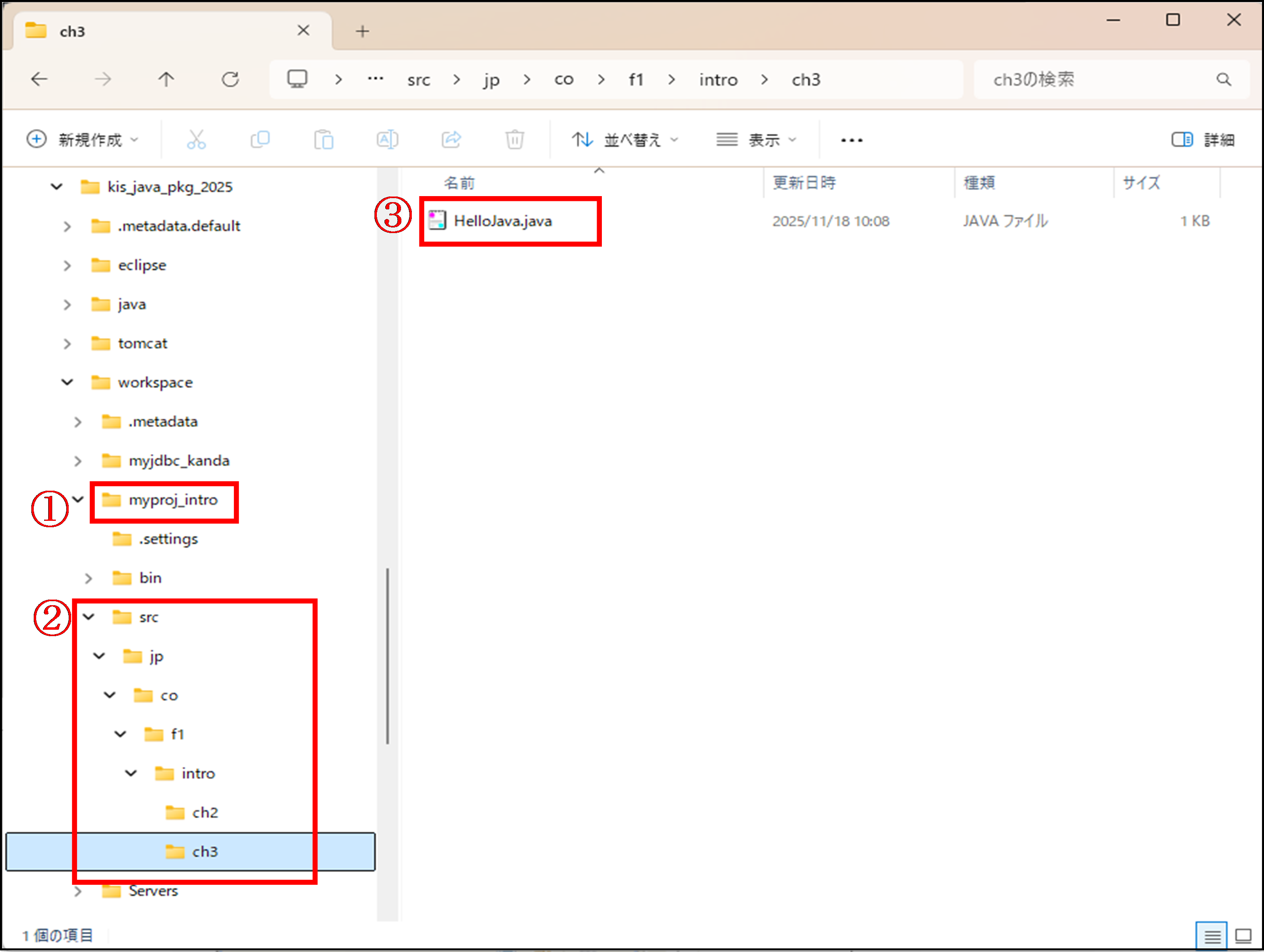 「ch3」フォルダまで到達すると、「HelloJava.java」ファイルが見つかります。