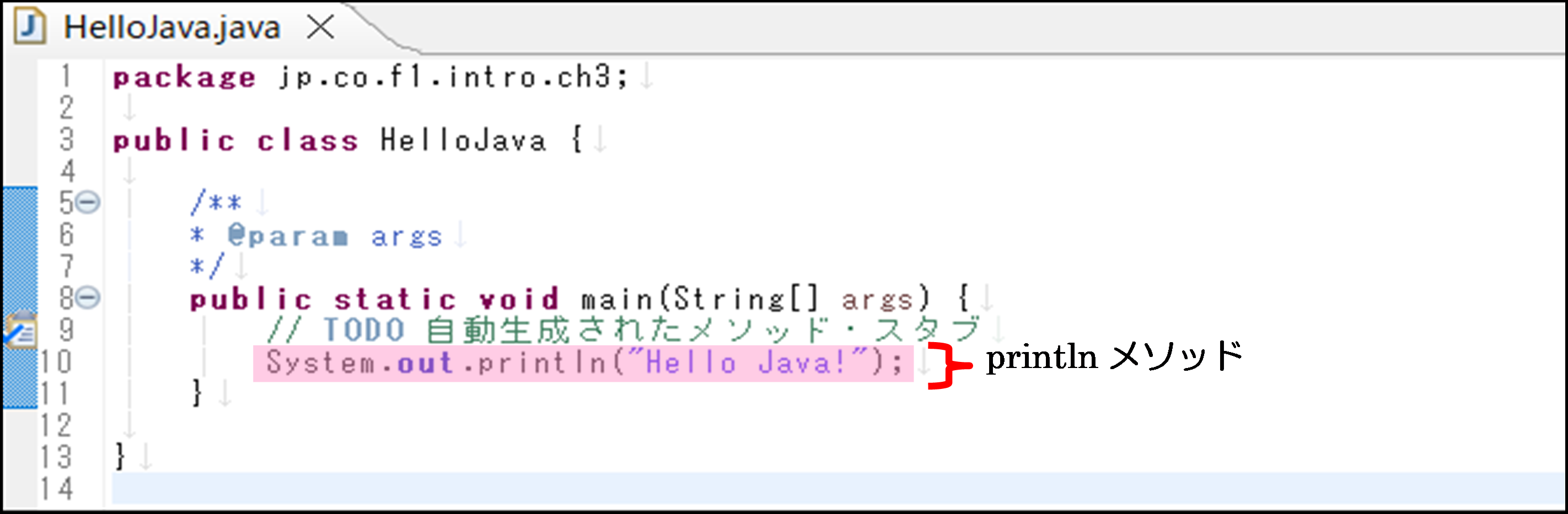 今取り組んでいるHelloJavaプログラムには、2つのメソッドが含まれています。1つ目は、図 3.1.11で表しているmainメソッドで、2つ目は、図 3.1.12で表しているprintlnメソッドです。