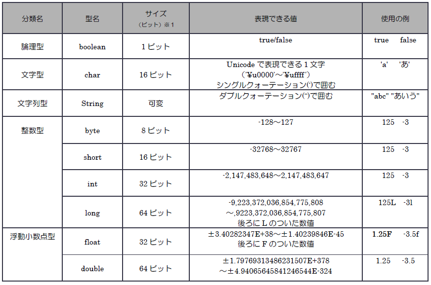文字列を扱う String 型以外は、最も基本的なデータ型で基本データ型(プリミティブ型)と呼ばれます。一方、String 型は「参照型」と呼ばれます。(参照型については、「Java 基礎テキスト」で詳しく取り上げます。)
