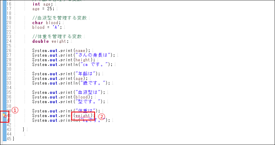 8~24 行目で、5 つの変数を宣言し、double 型の変数 weight 以外はそれぞれの変数に値を代入しています。