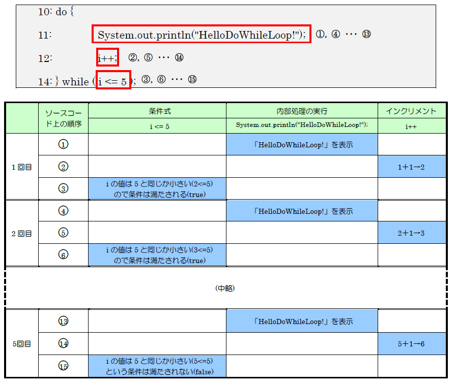 次の表は、このプログラムのdo-while文の流れを表したものです。まず初めに内部処理である「HelloDoWhileLoop!」というメッセージの表示を行った後にインクリメントが行われ、ループの最後に条件式が判定されます。