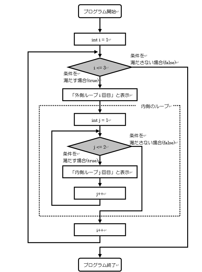 このfor文の二重ループの流れは、図 7.5.1のフローチャートで確認して下さい。