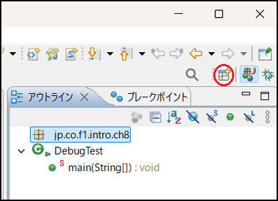 Eclipseのデバッグを行うには、まず、デバッグパースペクティブへの切り替えをします。