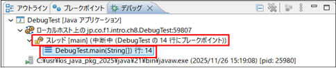 DebugTest.javaを右クリック > デバッグ > Javaアプリケーション