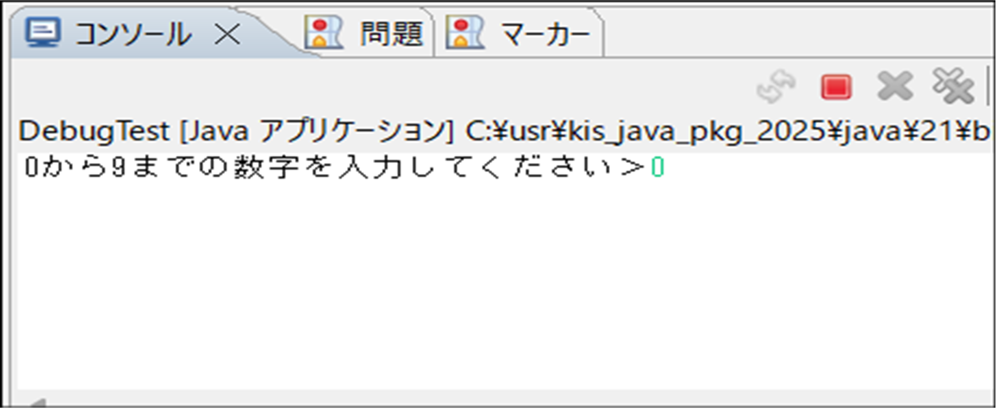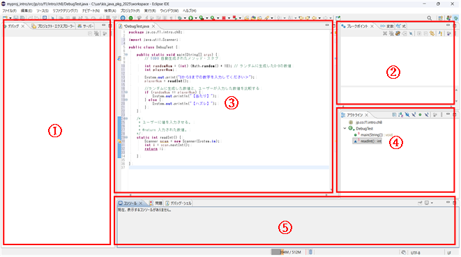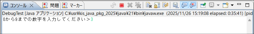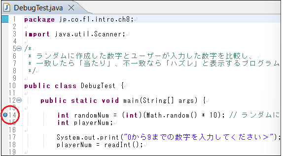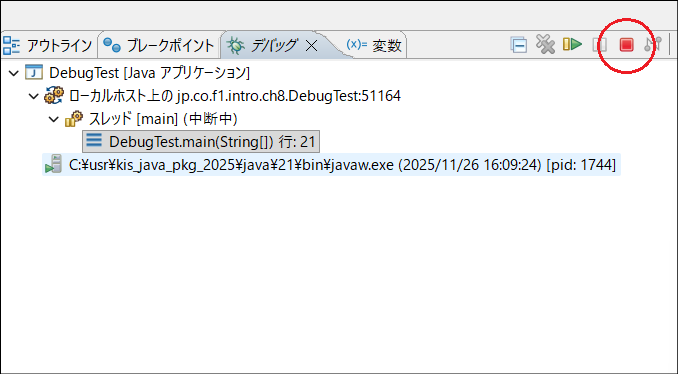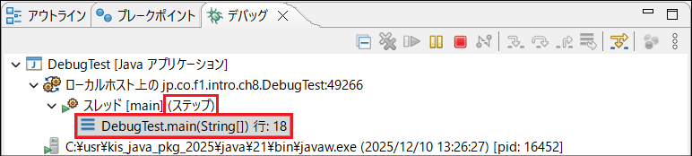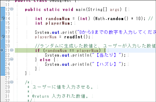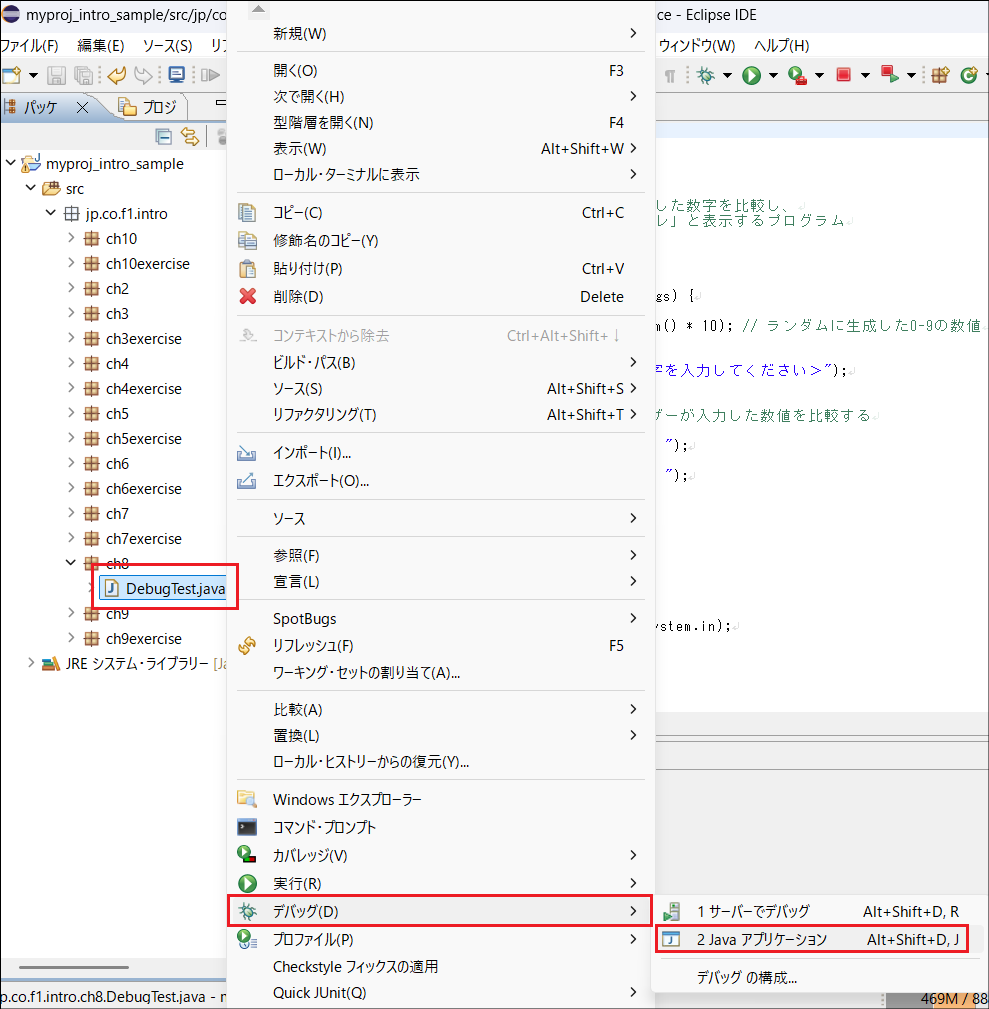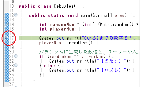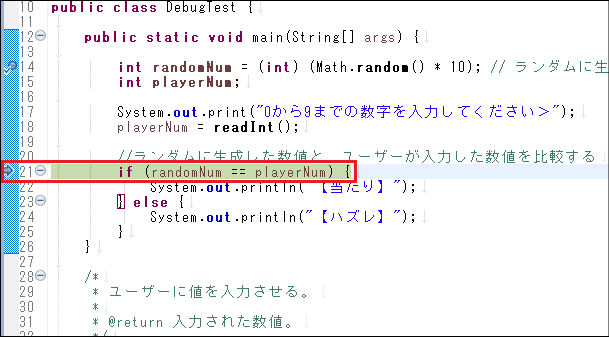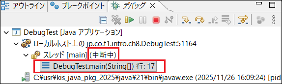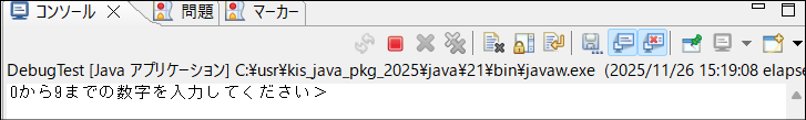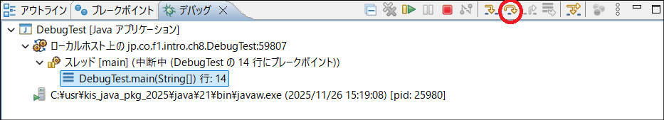 DebugTest.javaを右クリック > デバッグ > Javaアプリケーション