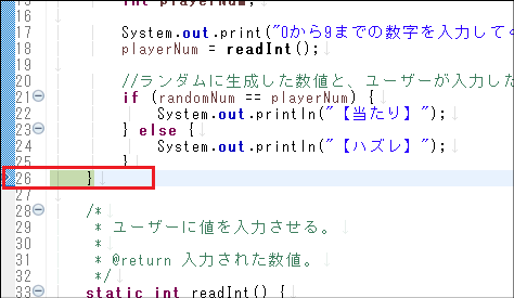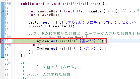 ステップオーバーをクリックすると、21行目の条件文がtrueなので、そのままif条件文の中に入り、22行目が実行される直前で停止します。この時点ではまだ22行目が実行されていないので、「【当たり】」という文字列は表示されません。