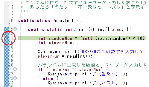 次に、ブレークポイントの設定を行います。今回は、ソースコードの14行目にブレークポイントを設定してください。