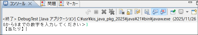 先ほどの変数ビューで確認したrandomNumと同じ値、つまり「当たり」になる数字「3」を入力し、Enterを押して先に進みましょう。