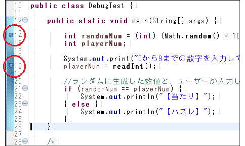 まず、14行目と18行目にそれぞれブレークポイントを設定してください。