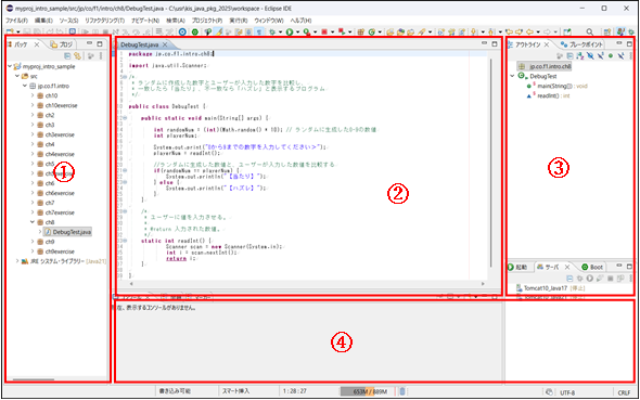 デバッグパースペクティブには、デバッグに必要なビューが配置されています。Javaパースペクティブは、Javaでコーディングを行う際に使います。