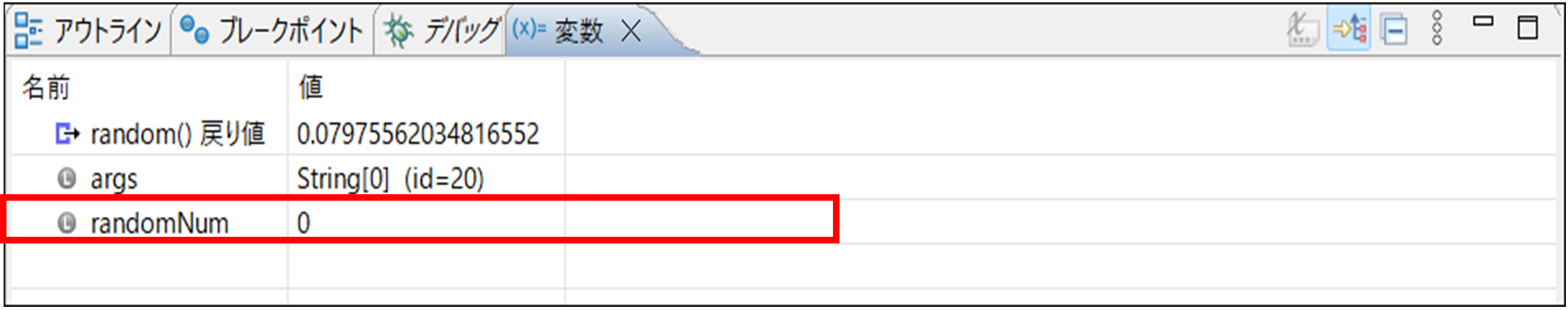 では、右上の変数ビューを見てみましょう。そこには、14行目で作成した変数randomNumが表示されています。Mathクラスのrandomメソッドを利用して作成した値は、今回の場合は「3」だったことがわかります。
