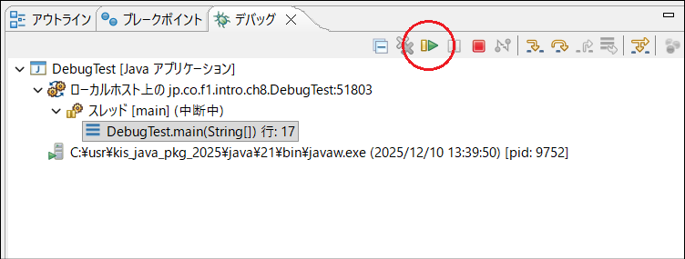 続いて、「再開」を行ないます。デバッグビューの「再開アイコン」を押下してください。これによって、次のブレークポイントまでプログラムを一気に実行します。