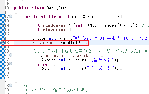 例えば、このDebugTestプログラムにはint型の変数randomNum、int型の変数playerNum、int型の変数i等の変数の宣言が書かれていますが、図 8.2.12の変数ビューで表示されているのはその内の一部のみで、これらは、17行目が実行される直前で停止している時点で有効な変数です。変数playerNumは、15行目で宣言がされているもののこの時点では初期化がされていないので表示されません。