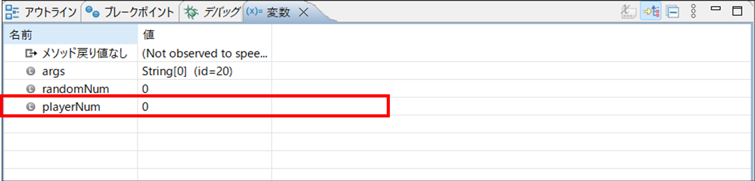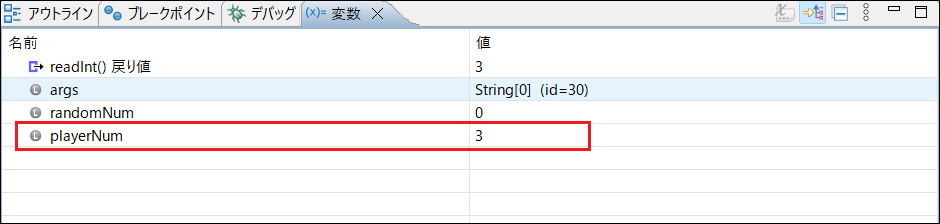 5. int型の変数playerNumの値を確認