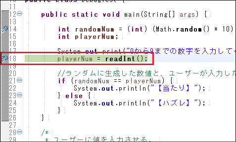プログラムが作成できたら、Eclipseのデバッグ機能を使い、意図した通りに処理が行われているかどうかの確認を行ってみましょう。