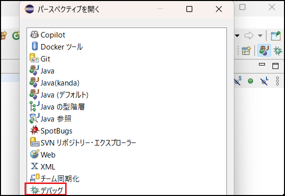 Eclipseに「デバッグ」が表示されていない場合