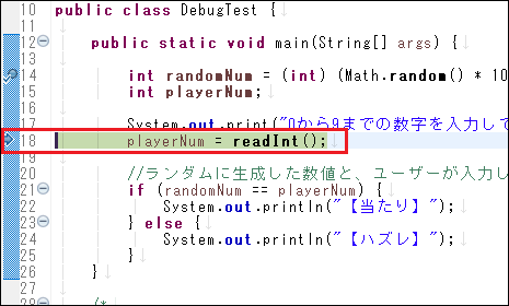 Eclipseのデバッグでは、ブレークポイントという箇所を設定し、そこでプログラムを一時中断することができます。その中断箇所から、ステップオーバーというコマンドを使い、現在アクティブになっているプログラムを1ステップずつ実行することができます。この流れを確認していきましょう。