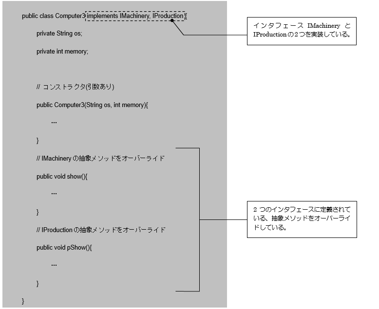 このComputer3クラスは4行目の記述で、2つのインタフェースIMachineryとIProductionを実装しています