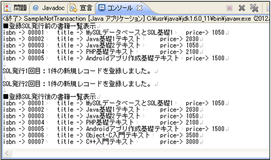 このプログラムでは、今まで作成したプログラムと同様にトランザクション処理を行なっていないため、SQL文が実行されると即データベースに処理の結果が反映します。実行結果を確認すると2回目のSQL文を実行した直後の表示結果にデータが反映しているのが確認できます。
