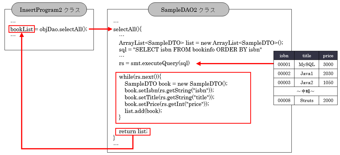 16行目ではSampleDAO2クラスのselectAll()メソッドを呼び出し、テーブルに登録された全ての情報を検索しています。その戻り値としてArrayList<SampleDTO>オブジェクトを受け取っています。