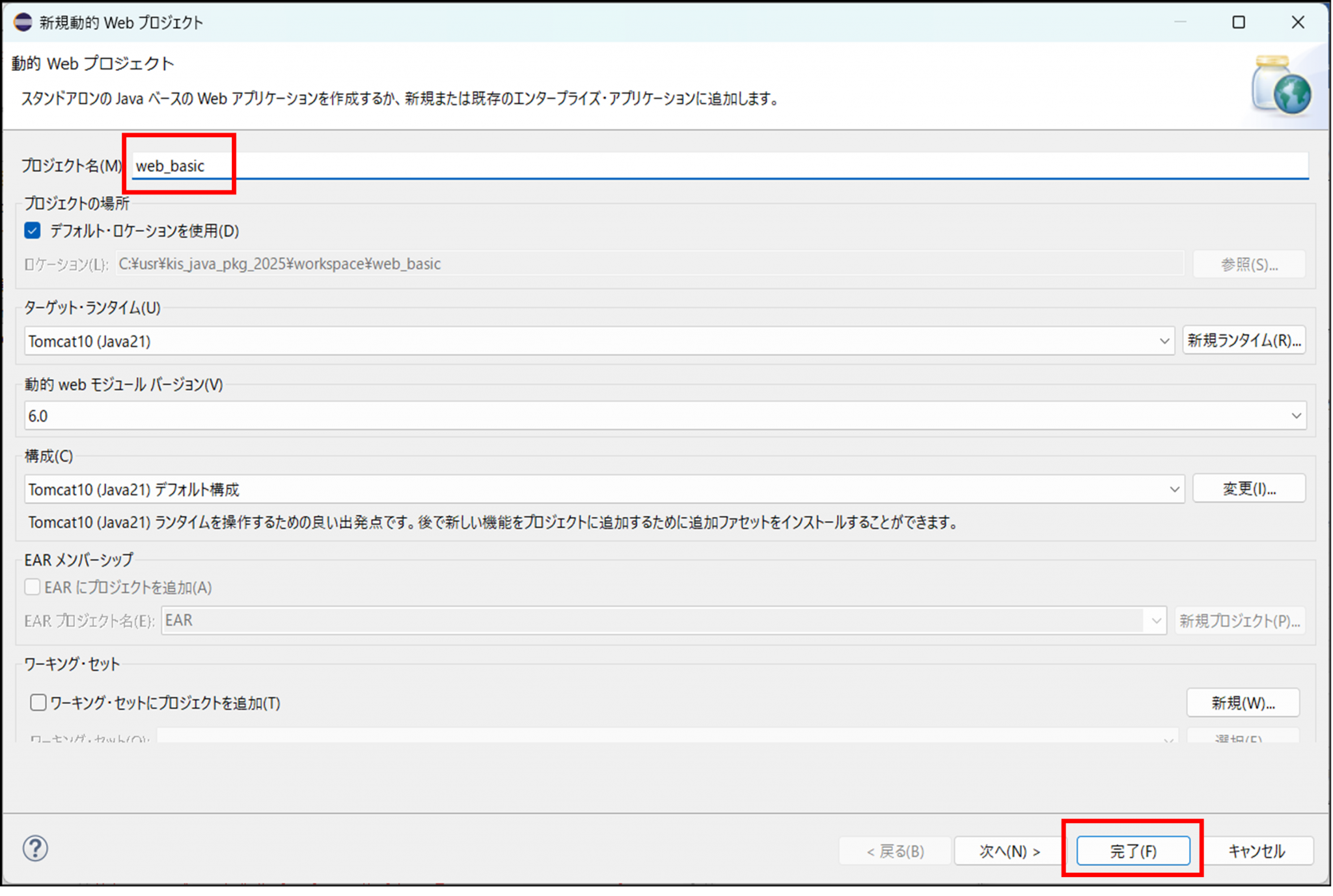 プロジェクト名に「web_basic」と入力し、「完了」ボタンを押下します。