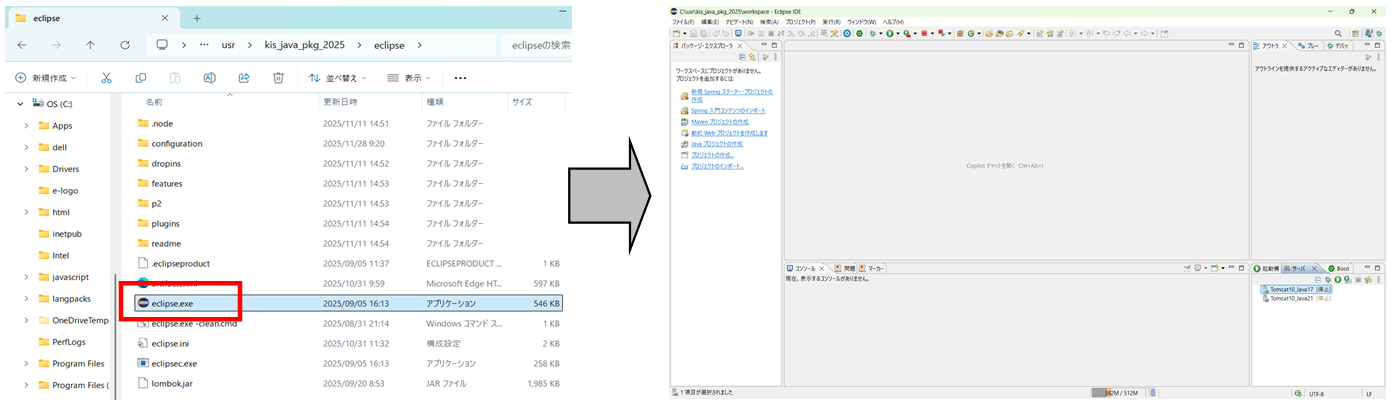 「C:\usr\kis_java_pkg_2025\eclipse」フォルダ内の「eclipse.exe」をダブルクリックしてEclipseを起動します。