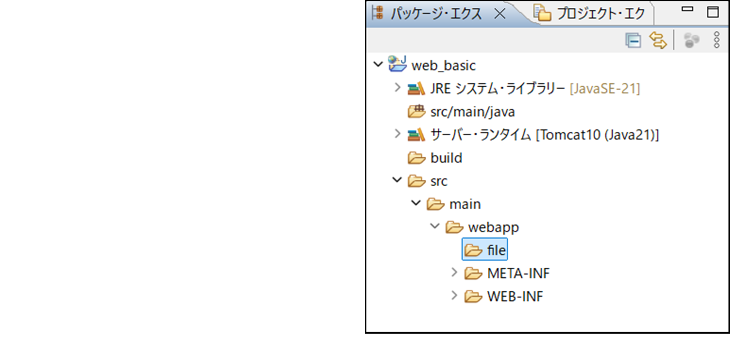 パッケージ・エクスプローラー内のwebappプロジェクトの直下に「file」フォルダが作成されます。