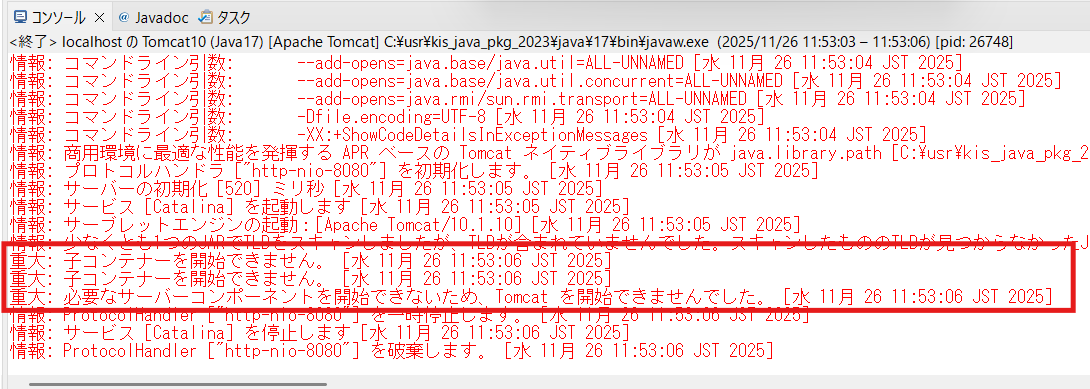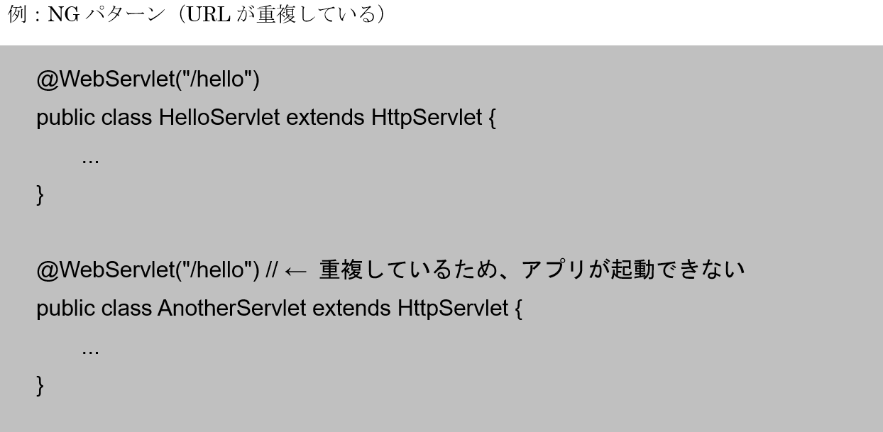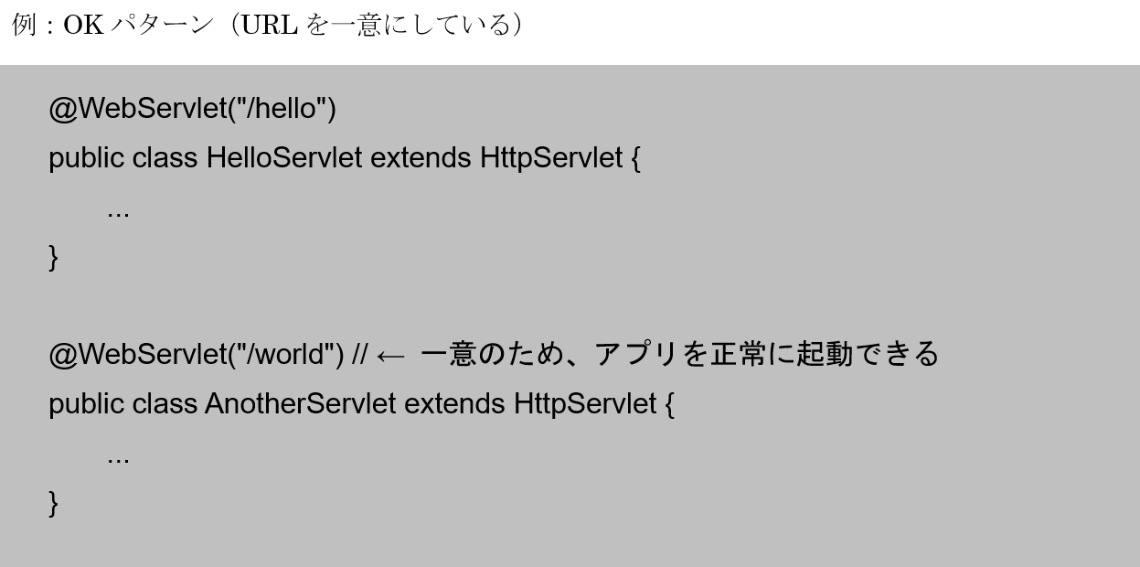 同じURLを複数のサーブレットに指定すると、どちらで処理するかを区別できず、起動エラーとなります。 サーブレットごとに異なるURLを指定し、一意にするようにしましょう。