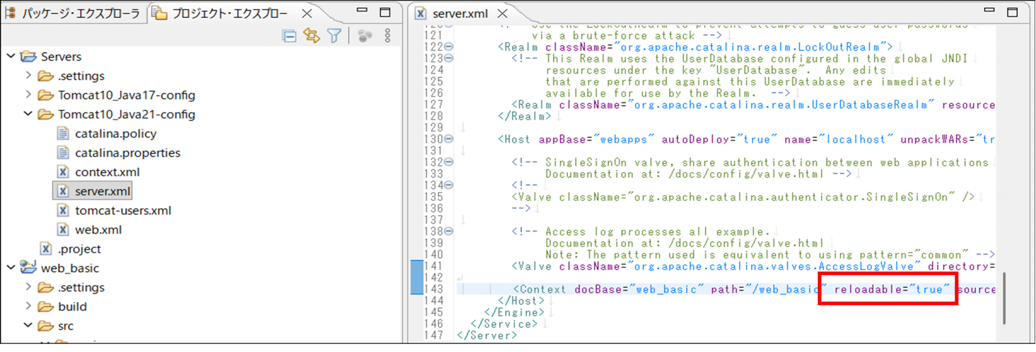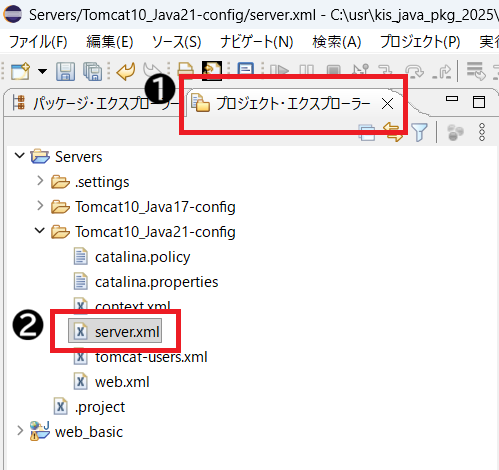 もし、都度Tomcatの再起動を選択することが面倒な方については、一度、プロジェクト・エクスプローラーの一番上にあるServersフォルダ内にある「Tomcat10_Java21-config」フォルダを開き、server.xmlを開きます。